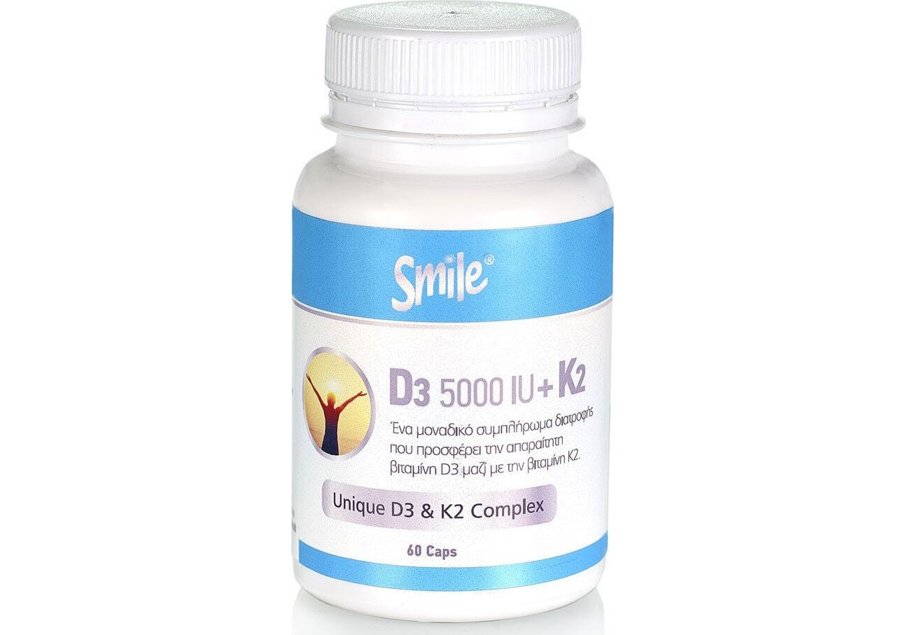 Το Smile D3 5000 IU + K2 είναι ένα συμπλήρωμα διατροφής με τις δραστικές μορφές των βιταμινών D και K, για την υγεία των οστών.