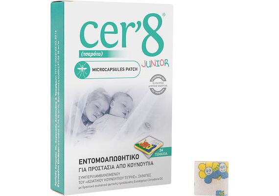 Το αυτοκόλλητο CER’8 Junior αποτελεί το ιδανικότερο απωθητικό κουνουπιών για τα μικρά παιδιά χωρίς να έρχεται σε επαφή με το ευαίσθητο δέρμα τους και ταυτόχρονα προστατεύει χωρίς να λερώνει και χωρίς να χρειάζεται επάλειψη ή ψεκασμός.