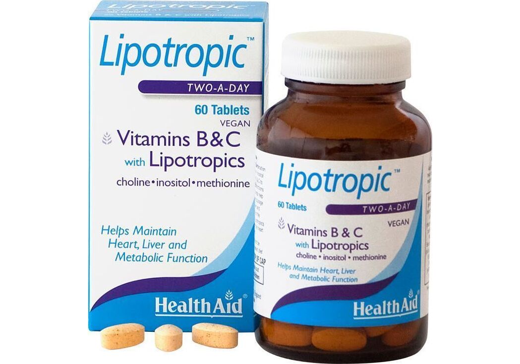 Το Lipotropic της Ηealth Aid είναι μια λιποδιαλυτική σύνθεση, που συντελεί στο μεταβολισμό των λιπών, στη δημιουργία ενζύμων και ορμονών και στη διατήρηση της καλής λειτουργίας του συκωτιού, παράλληλα ελέγχει τα επίπεδα της χοληστερίνης στο αίμα και μειώνει το σωματικό βάρος. Η Χολίνη βοηθάει στο να μην επικάθεται η χοληστερίνη στις αρτηρίες και δρα συνεργικά με την ινοσιτόλη. Η Ινοσιτόλη μεταβολίζει τα λίπη και βοηθά στην αναδιανομή τους στον οργανισμό. Η Μεθιονίνη είναι ένα λιποτροπικό αμινοξύ, που μειώνει τα λίπη στο συκώτι και βοηθάει στη δημιουργία ενζύμων για την υγιή λειτουργία των κυττάρων. Οι Βιταμίνες Β προάγουν τη διάσπαση των λιπών σε μικρότερα κομμάτια (γαλακτωματοποίηση), ώστε να «καίγονται» από τον οργανισμό κατά τη διάρκεια της καθημερινής του δραστηριότητας. Η Βιταμίνη C δρα σαν ισχυρό αντιοξειδωτικό και προστατεύει τα κύτταρα από τις ελεύθερες ρίζες. Οβάλ σχήματος ανοιχτές κίτρινες διάστικτες ταμπλέτες. 60 ταμπλέτες σε καφέ γυάλινο φιαλίδιο.