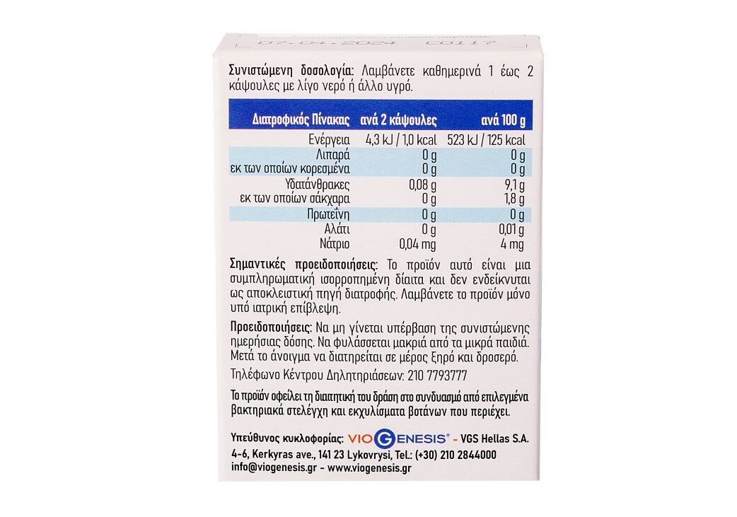 Συνιστώμενη δοσολογία: Λαμβάνετε καθημερινά 1 έως 2 κάψουλες με λίγο νερό ή άλλο υγρό